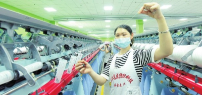 3月9日,汉川市名仁纺织科技有限公司员工正在生产线上作业。