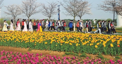 近日,游客在孝南区朋兴乡金卉庄园赏花。该园种植郁金香100余亩,有阿波罗、阳光王子、红色力量等116个品种。连日来,该园郁金香争相绽放,花艳似海,游人如潮,平均每周接待游客2万余人次。
