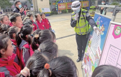 3月28日是第27个全国中小学生安全教育日。孝感交警直属一大队走进城际小学,开展丰富多彩的交通安全宣传活动,全面提升学生交通安全防护、文明守法意识,有效预防道路交通事故发生。(全媒体记者刘艳 通讯员邹晨摄)