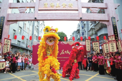 在蒲阳美食街,道路两侧的诗词灯如荧荧流星悬于夜幕中,古筝古琴、抬旗游街、传统舞狮等特色展演吸引众多游客前来拍照打卡。
