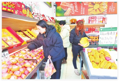 元月27日,孝南区朋兴乡居民在胜利街一水果商铺挑选水果。香梨,圣女果,金钱橘,耙耙柑等50多种水果,品种齐全,货源充足。目前,购物人流明显增加,呈现出购销两旺的场面。