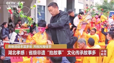 孝感民俗传统文化同样引起央媒普遍关注。2月11日,人民日报客户端推送报道《非遗传承的青春力量(新时代画卷)》,图片报道孝感青年演员陈加平现场表演大鼓;13日,央视中文国际频道《中国新闻》和《今日环球》栏目,3次播发报道《湖北应城:国潮出圈戏伢子联唱中华戏曲》,宣传推介应城2024年春节联欢晚会;25日,央视中文国际频道《中国新闻》播出孝感市孝南区肖港镇金神村表演的省级非遗“抬故事”,向国内外观众展示孝感非遗文化保护发展成果。