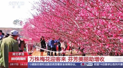 2月17日,央视新闻频道《新闻直播间》栏目播出新闻《湖北孝昌:万株梅花迎客来芬芳美丽助增收》,向全国观众展示了孝感市孝昌县邹岗万株梅花绽放的盛景。