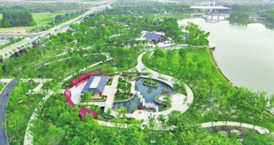 4月26日,航拍邓家河湿地公园一角。该公园位于孝汉大道南侧,目前D区园区建设及绿化施工已完成。据悉,邓家河公园建成后,将强化邓家河水系的生态功能和区域水环境治理,推进海绵城市建设,增强片区防涝能力。