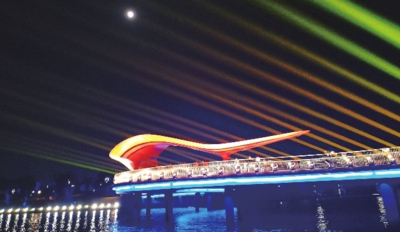 灯光秀以天空、陆地、水面多维空间为舞台,结合灯光、激光等多重艺术手段,展现极具科技感的光影效果。■全媒体记者李文勇摄
