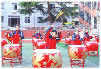 11月21日,汉川市仙女山一小的学生在校园跟着家长学习中国鼓表演。