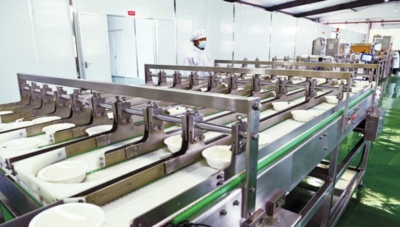 12月11日,在安陆市的湖北美时园食品股份有限公司生产车间,工人正在生产线赶制自热米饭订单。公司是一家专业研发、生产和销售米制方便食品的企业。